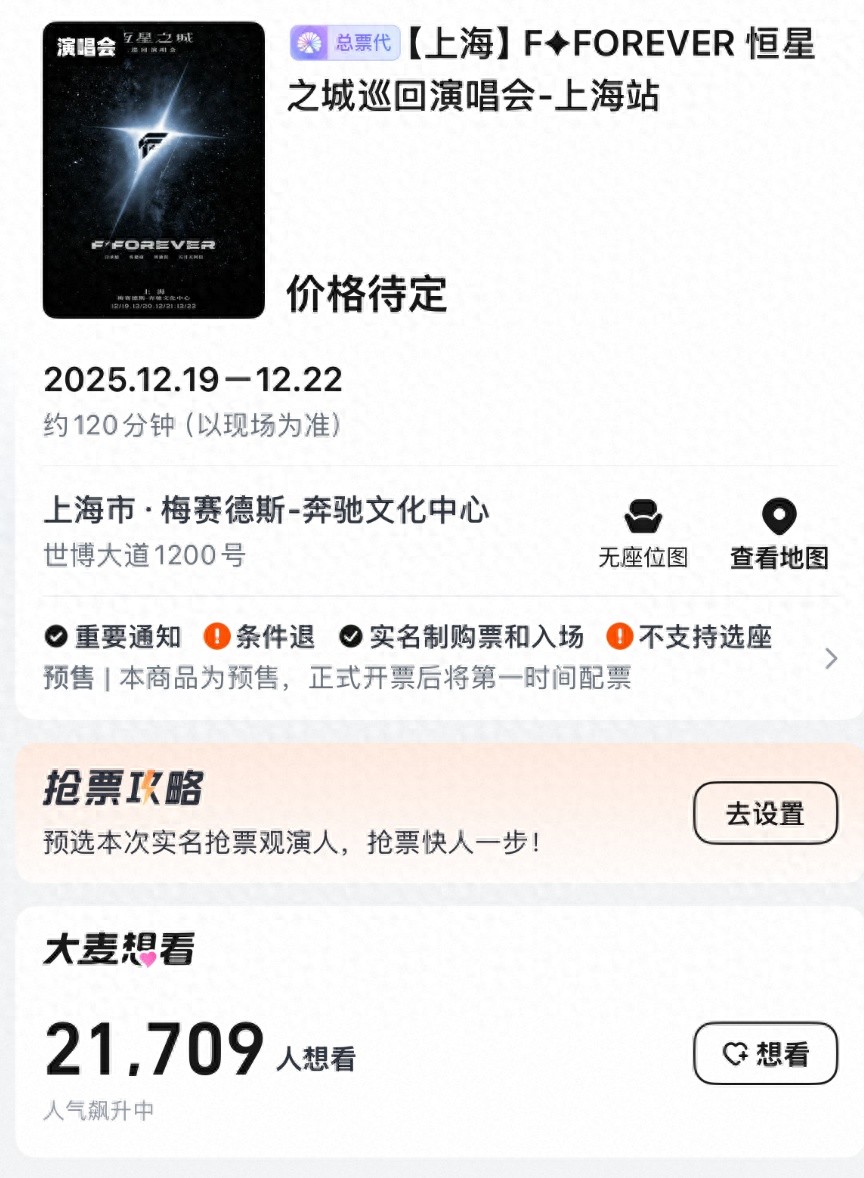 12月4日,大麦网显示,“FFOREVER 恒星之城巡回演唱会-上海站”即将开售,此次演唱会将于12月19日至22日在上海梅赛德斯奔驰文化中心举行,票价暂未公布,目前已有2万多人标记“想看”。