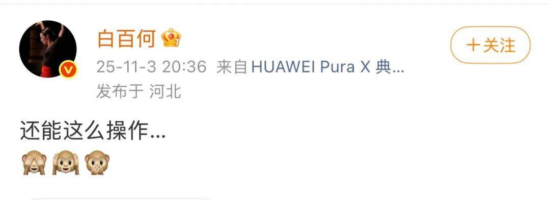 更让人费解的是,11月3日,白百何忽然在个人社交账号发文:“还能这么操作……”并配了捂眼睛、捂耳朵、捂嘴巴三个表情包,让更多网友忍不住前来深度“解读”。