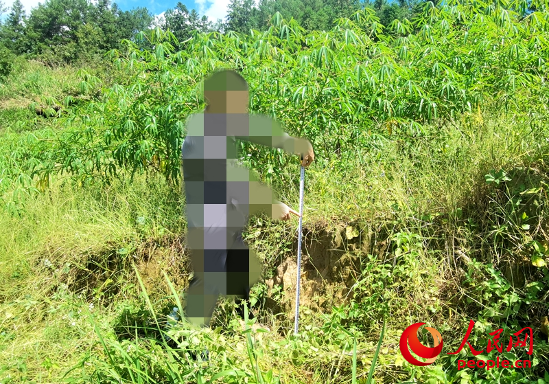 沿着山体往东面走,是一片仍在种植蔬菜、木薯等农作物的田地。村民介绍,受山体滑坡影响,这片耕地发生沉降。记者在现场测量,发现沉降高度在0.6米至2米不等。