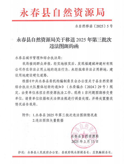 今年3月,永春县自然资源局向县城市管理和综合执法局移交城坤公司违法线索。