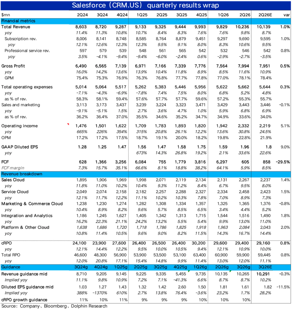 SaaS龙头Salesforce,于12月4日早美股盘后,公布2026财年3季度财报(截止10.31日)。当季业绩并不好,各主要指标基本都跑输市场预期。相对欣慰之处是,领先指标(cRPO和新签订单)在低基数下略有向好趋势。亮点是,公司指引下季度的增长会有不小改善,但主要是收购Informatica的并表影响,具体来看: