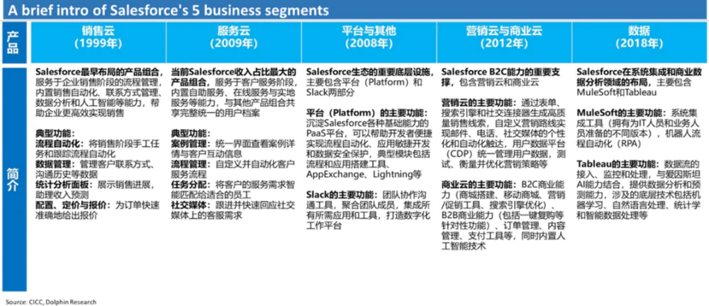 ⑤ 平台云(Platform & others):Salesforce其他SaaS服务依赖的基础设施和服务,类似PaaS(Platform-as-a-service)。也包含类似于微软Teams的团队协作SaaS服务Slack。