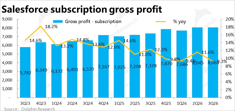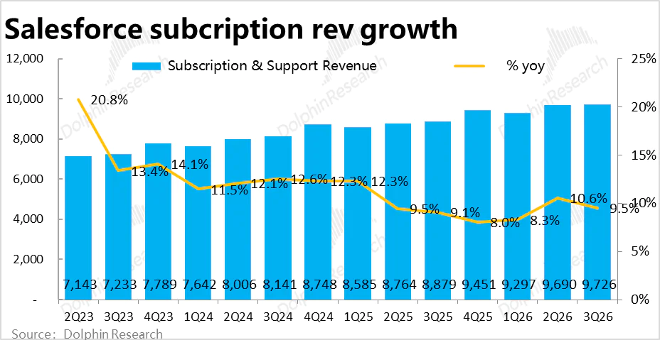 增长端,本季Salesforce的核心业务--订阅性收入约$97.3亿,同比增长9.5%,较上季又放缓了1.1pct,略不及市场预期。从已经过去的后视镜看,增长仍然相当疲软,不仅没有再加速迹象,反而在进一步放缓。