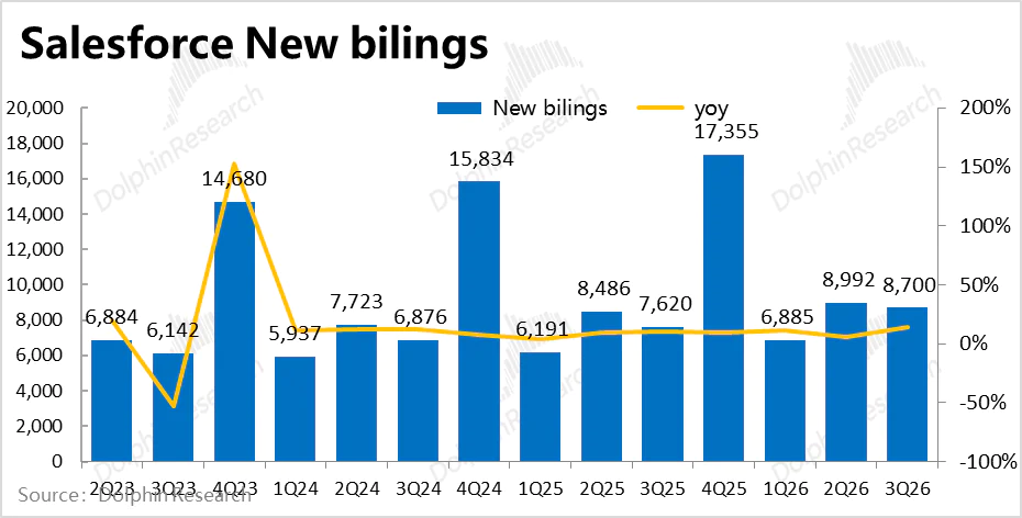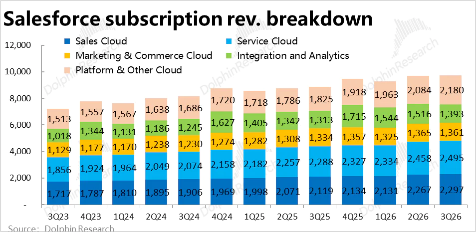 2)而目前AI Agent应用最广的客服云,以及作为所有Agentforce服务基础的平台云则表现不错。其中,服务云增9%,增速环比略微走高0.1pct,虽也不算强劲但对比其他业务线的放缓已属不错。