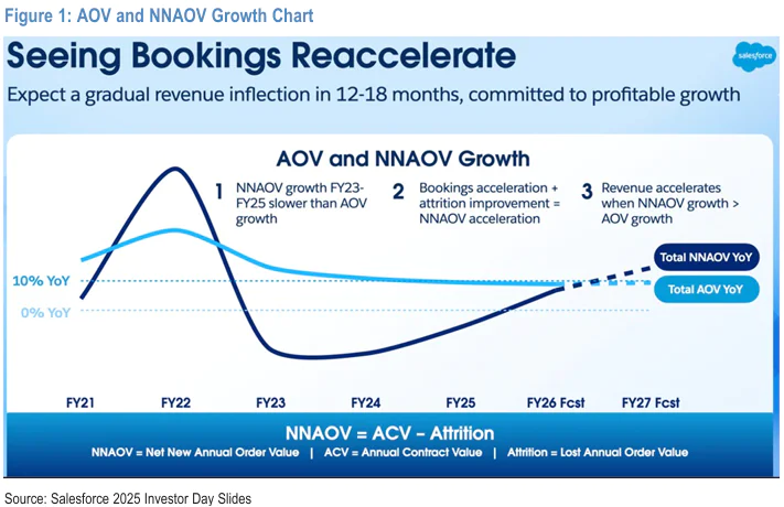 2)此外,公司在10月的Dreamforce大会上也给出了两个比较关键的远期展望。首先,由下图可见,公司披露的NNAOV(Net-new Annual Order Value, 指剔除丢失的老合约后当年新增的净合同金额),在净利率23~25财年的负增长后,近期逐步改善且当前有向上突破10%增速的势头。 作为一个领先指标,公司预期在未来12~18月内这将传导到收入增长的再提速上。