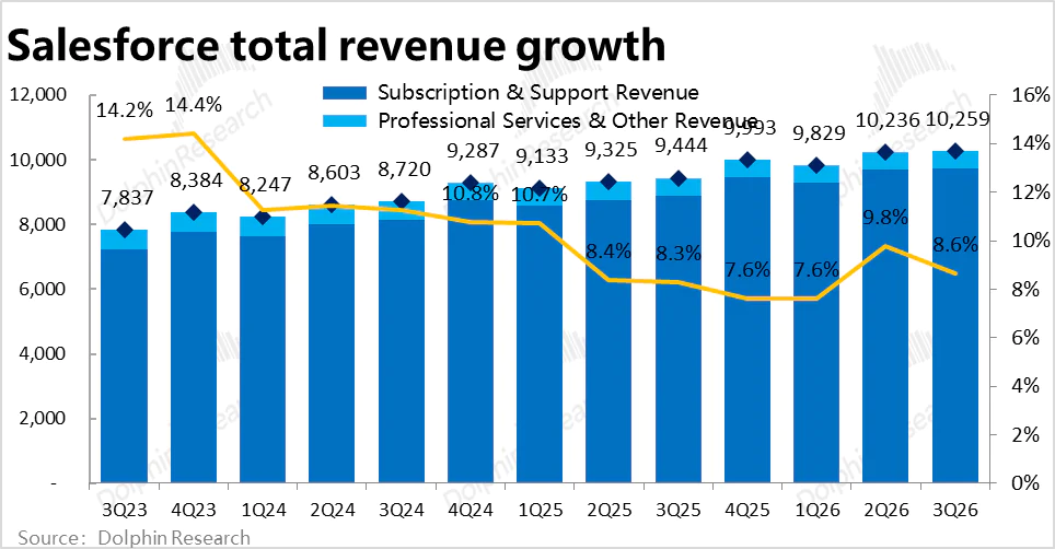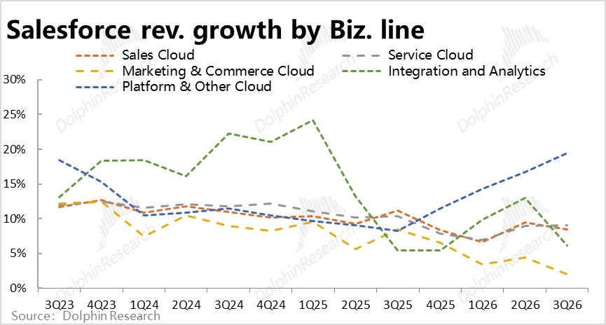 分细分业务线看,传统业务的增长在继续放缓,而和AI Agent更相关的服务云和平台云的表现则不错。