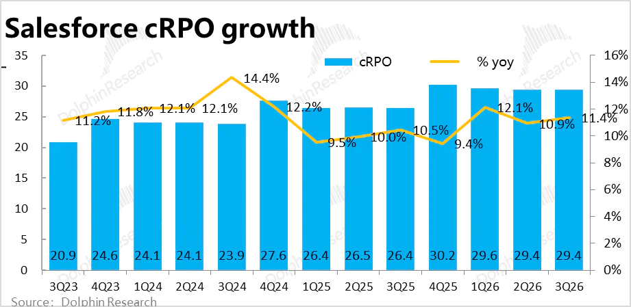 相比整体继续走弱的当季营收,反映后续增长前景的领先指标增长相对更好些,但也还算不上强劲。——其中cRPO(短期未履约余额)的名义同比增速本季为11.4%,较上季提速0.5pct。不过cRPO余额294亿与上季完全持平。