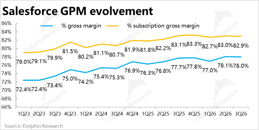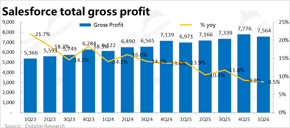 由上文可见,Salesforce本季业绩表现显然算不上好。相比市场预期基本是全面跑输(除了控费)。且趋势上,收入增长继续放缓,毛利率也开始边际走弱,虽然控费效果依然出色,保住利润的增长仍算不错,但由于AI投入带来的毛利率下滑,利润领跑收入增长的幅度也还是在收窄的。