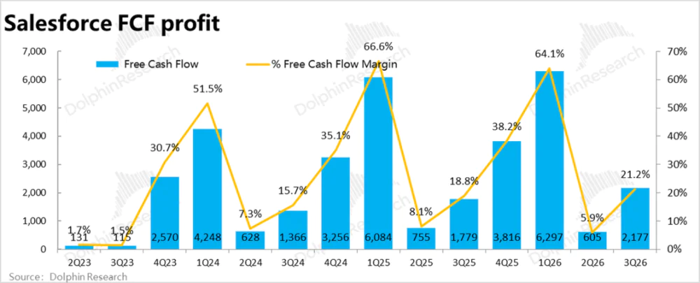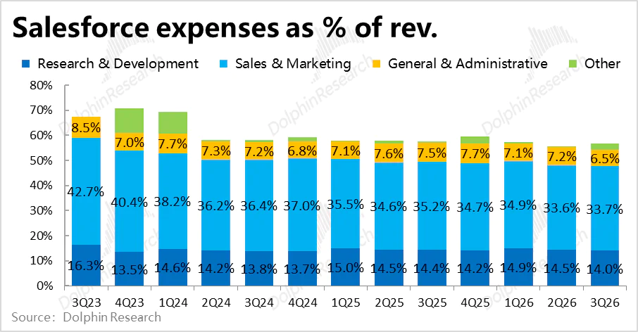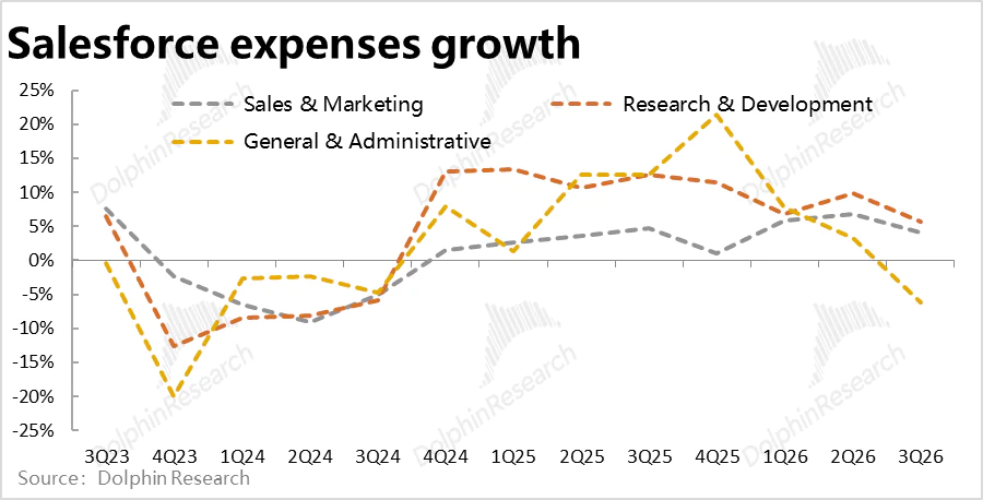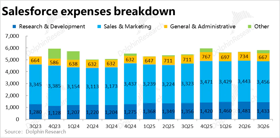 4、控费则依然优秀:Salesforce本季总经营费用支出$58.2亿,同比增长6.8%,较上季略有提速,但比市场预期稍低。其中,营销和研发费用都仅同比增长中个位数%,管理费用更是同比下滑约6%。可见公司的费用投入并没有因Agentforce等新业务的发展而有明显的提升。
