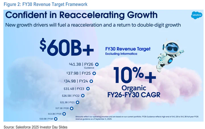 更长期视角,公司设置了30财年实现600亿的营收目标(不包括并表Informatica的影响),隐含FY26~30年的收入复合增速能保持在10%左右,虽也没有较当前有明显的提速,但至少反击了市场担忧的公司后续增长会继续放缓,最终可能仅会略高于GDP增速的中个位数%。