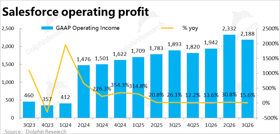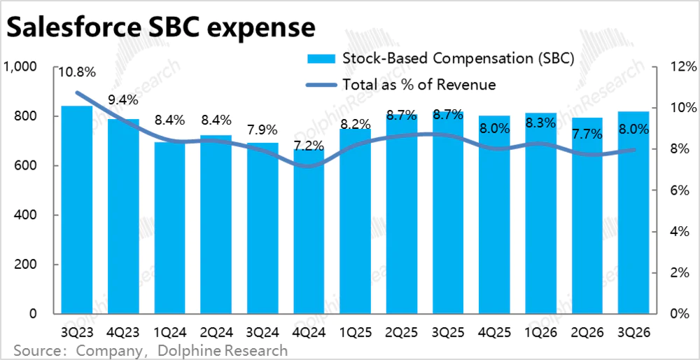 费用上,Salesforce本季总经营费用支出$58.2亿,同比增长6.8%,较上季略有提速但比市场预期稍低,也低于收入和毛利润增速。换言之,费用投入并没有因Agentforce等新业务的发展有非常明显的走高,仍是靠着控费(费用率同比下降了1pct)对冲了毛利率走弱的影响。