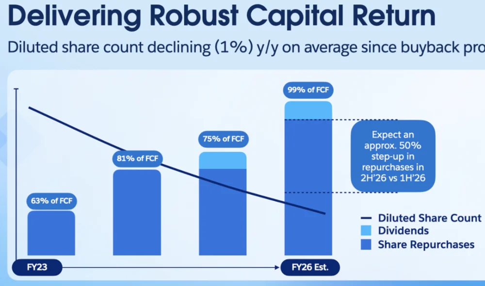 此外,如前文提及的,公司宣布了在下半财年将加大股东回报力度,26财年计划将几乎所有自由现金流都通过回购或股息返还给股东。按26财年总共约$140亿的回购总额,对应当前市值的6.3%左右。