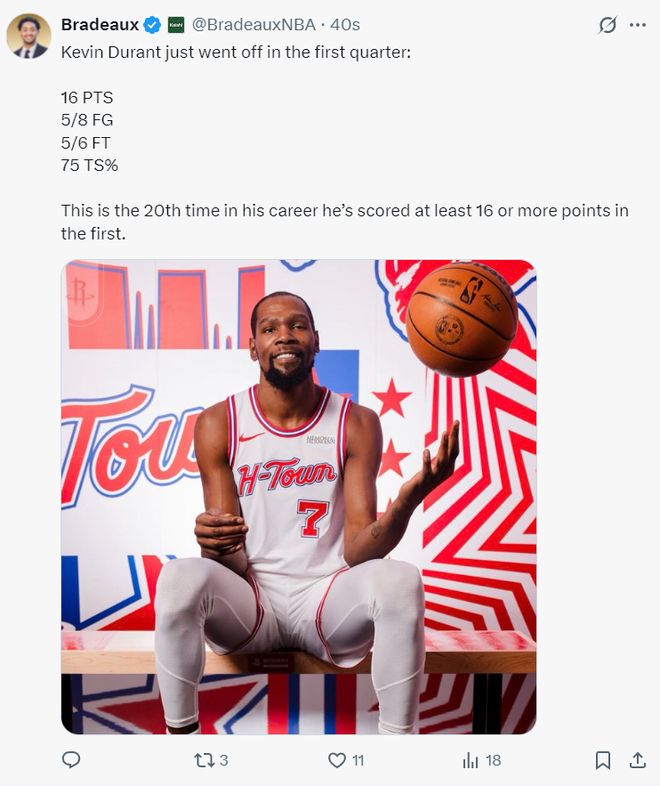 休媒:这是杜兰特个人生涯第20次单节16分或以上的比赛。