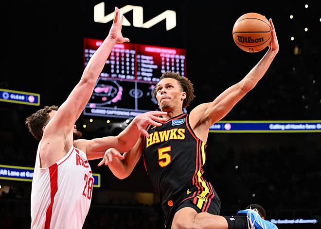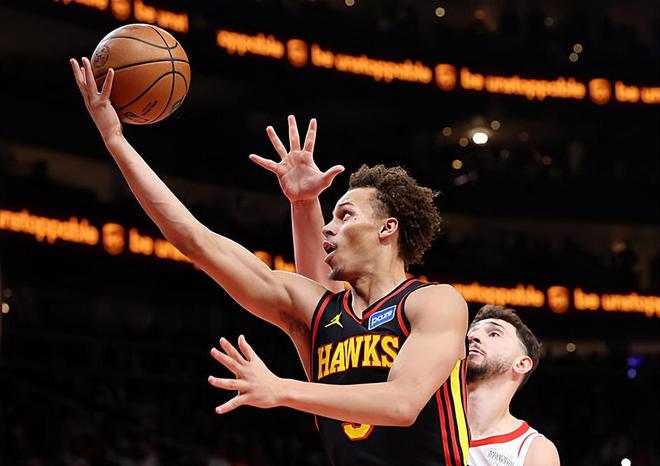 本场比赛中,老鹰的先发得分后卫戴森-丹尼尔斯(Dyson Daniels)的表现令人大跌眼镜。丹尼尔斯全场出场31分29秒,投篮12中2,三分线外3中0,得到了4分6篮板7助攻3抢断的数据,其中还包括了4个前场篮板,还有1次失误和2次犯规,正负值为+2。一方面,丹尼尔斯在防守端的表现绝对是值得肯定的,他也展现出了自己应有的个人防守能力并且起到了相当不错的效果。不仅如此,丹尼尔斯在篮板争抢方面的表现也是值得肯定的,而且他在传球和组织方面也是起到了一定的作用的。然而另一方面,丹尼尔斯的进攻效率实在是太糟糕了,他的突破能力完全没有发挥出来,他在外线投篮方面的稳定性更是惨不忍睹。