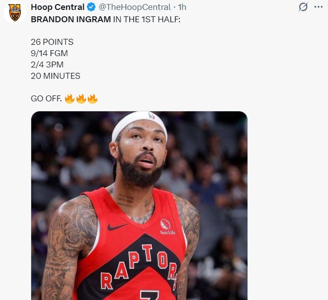 上半场猛龙是靠英格拉姆支撑,20分钟里14中9,三分4中2,拿到26分,尤其是首节7中5+三分3中2+罚球4中4,拿到16分,都觉得此役他要以一己之力扛起猛龙了,结果从第三节开始断电。