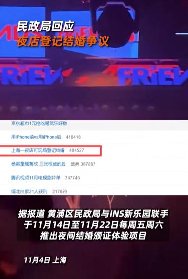 向阳视频就此事联系上海市黄浦区民政局婚姻登记处,一位工作人员介绍,新人必须在黄浦区民政局领证,不是在INS新乐园领的,先领证然后自愿选择是否去INS新乐园。同时,该工作人员表示,现场绝对没有登记领证环节。