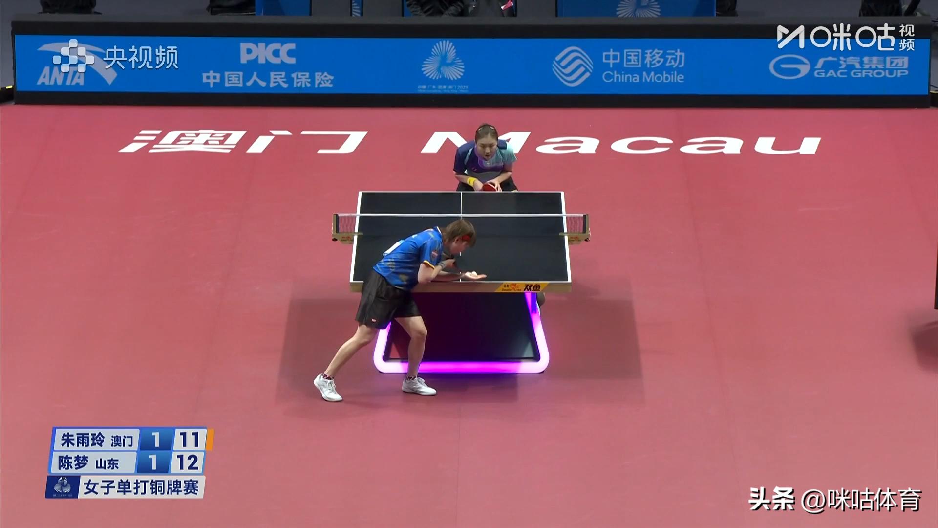 全场战罢,山东队陈梦4-1战胜中国澳门队朱雨玲 ,夺得女单铜牌,朱雨玲获得第四,局分:11-9、6-11、13-11、12-10、11-7。
