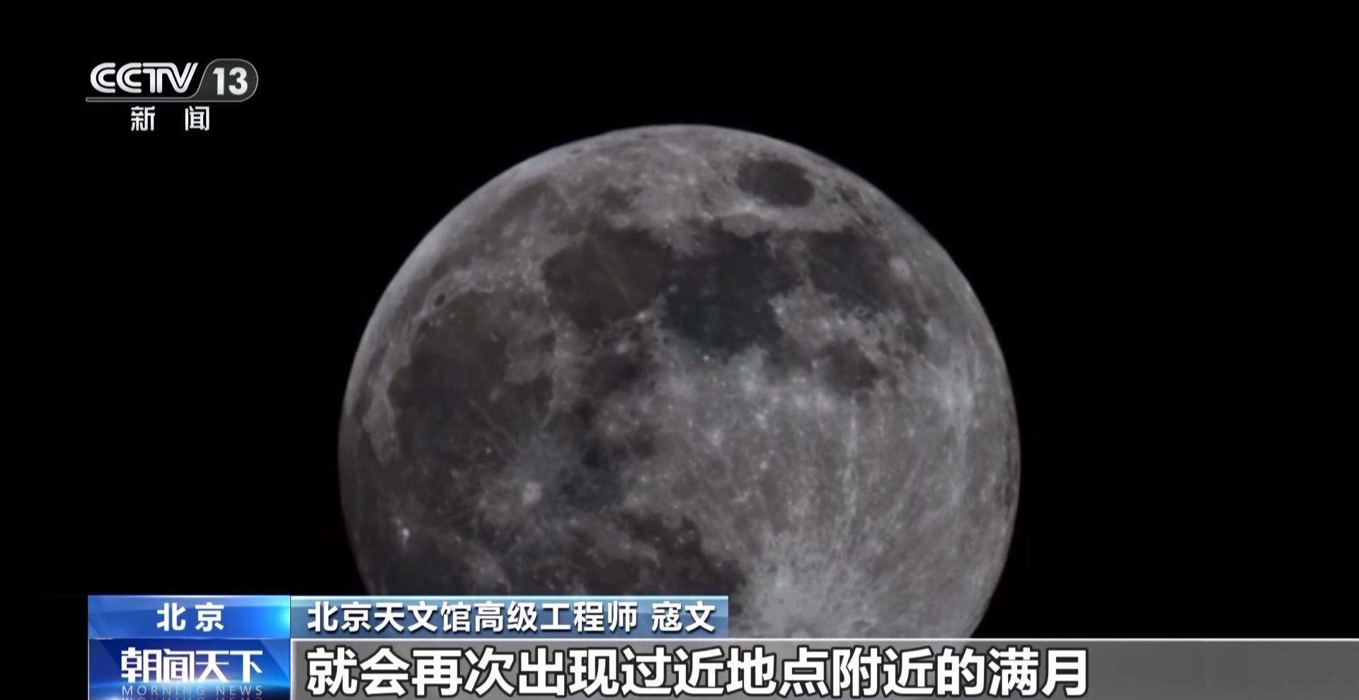 北京天文馆高级工程师 寇文:从一次近地点转一圈回来再到近地点需要27天半左右,这种朔望的变化,就是从一次满月到下一次满月平均29天半左右,这两个时间之间差了两天左右。所以一次近地点满月以后,再往后推两天,就是大概平均每隔十三四个月就会再次出现过近地点附近的满月。