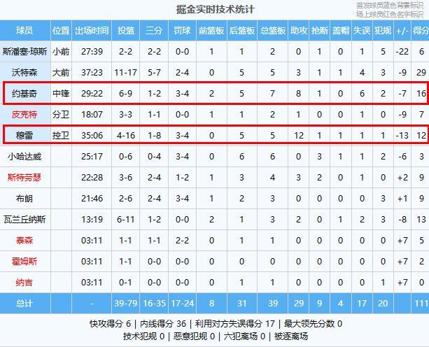 掘金:沃特森29分5板3助、约基奇16分7板8助、瓦兰丘纳斯13分3板2助、穆雷12分5板12助、斯特劳瑟9分4板3助2断、布朗9分3板、皮克特7分2板1助
