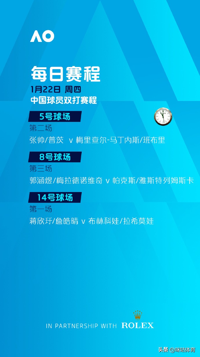 双打赛场,郭涵煜/梅拉德诺维奇、蒋欣圩/詹皓晴将分别出战女双第二轮,张帅搭档德国选手皮茨以混双6号种子身份亮相首轮。