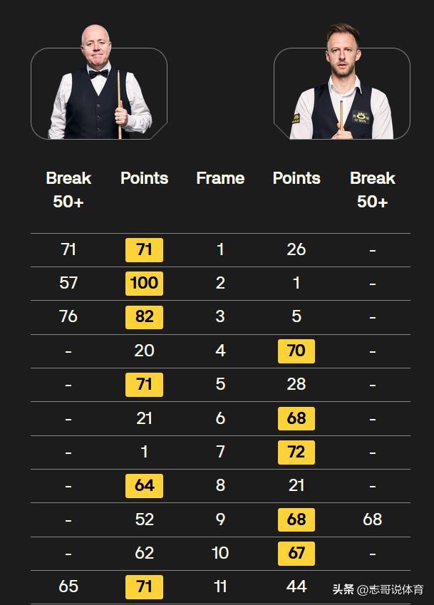 【希金斯6-5特鲁姆普】这是本轮的一场绝对对话,首先从世界排名来看,特鲁姆普高居第1位、希金斯高居第5位;其次两人都是世界冠军和大满贯球员,尤其是希金斯更是世锦赛4冠王。值得一提的是,希金斯单赛季排名第17位、奥沙利文退赛之后,希金斯拿到了球员锦标赛的入场券;特鲁姆普在本赛季的排名赛方面,拿到德国大师赛的冠军,以及北爱尔兰公开赛和英锦赛的亚军,总体上的成绩还是要好于希金斯的。