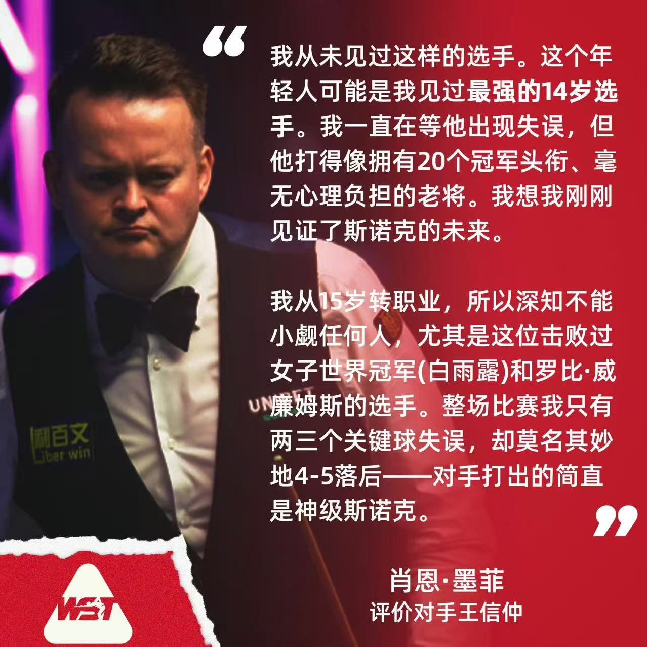 这其中14岁的业余选手王信仲,面对世界冠军墨菲的时候,展现出了超强的竞技状态,一度5-4率先拿到了赛点,结果还是由于经验不足,被墨菲实现了逆转,不过赛后墨菲对王信仲给予了高度称赞,成熟度仿佛像一位拥有了20个冠军的老将!