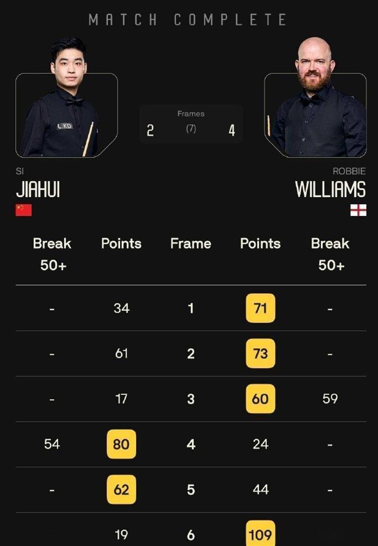 另一位出局的中国Top16球员是斯佳辉。 作为备受期待的中国00后领军人物之一,斯佳辉近期的状态一直起伏不定。本轮他对阵排名第56位的罗比·威廉姆斯,整场比赛斯佳辉虽然每局都有机会,但关键球的处理总是差之毫厘,最终以2比4败下阵来,无缘32强。