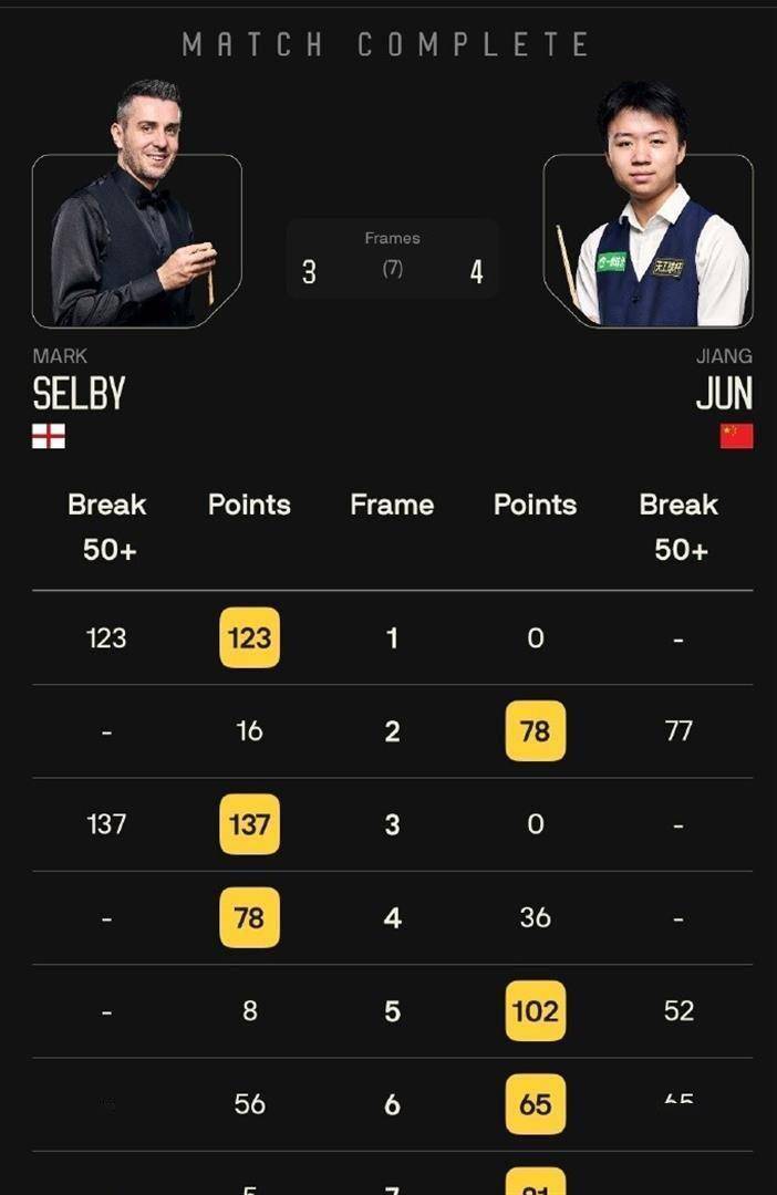 首个比赛日总共要决出16个32强席位。 当日的最大焦点,无疑是头号种子、卫冕冠军马克·塞尔比的首秀。 他的对手是从资格赛打上来的中国00后小将江俊,后者世界排名仅第81位。 比赛进程出乎了所有人的预料。 塞尔比开局展现了世界冠军的水准,连续轰出单杆123分和137分两杆破百,迅速取得了3比1的领先优势,手握多个赛点。