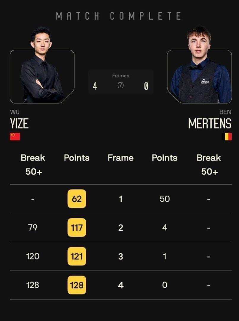 除了制造最大冷门的江俊,其他几位在首日出战的中国球员表现总体稳健。 世界排名第12位的吴宜泽状态火热,他面对比利时选手本·默滕斯,除了第一局以62比50险胜外,随后连续轰出单杆79分、120分和128分,直接连下四城,以4比0的比分轻松横扫对手,强势晋级。