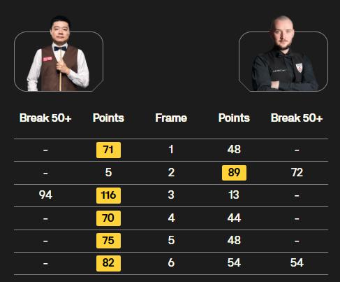 山姆-克雷吉开球不理想,丁俊晖轻松获得上手机会,不过并没有一杆致胜,而山姆-克雷吉又是在局末阶段出现失误,丁俊晖又抓住机会,75-48赢下第五局,丁俊晖4-1山姆-克雷吉!