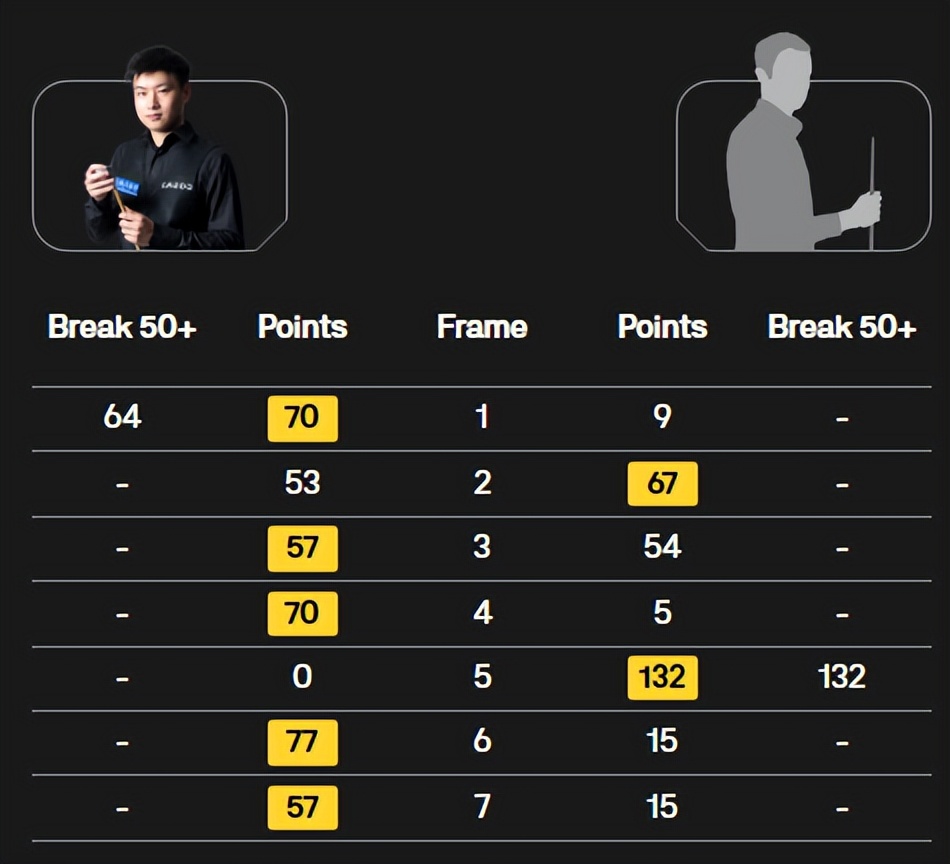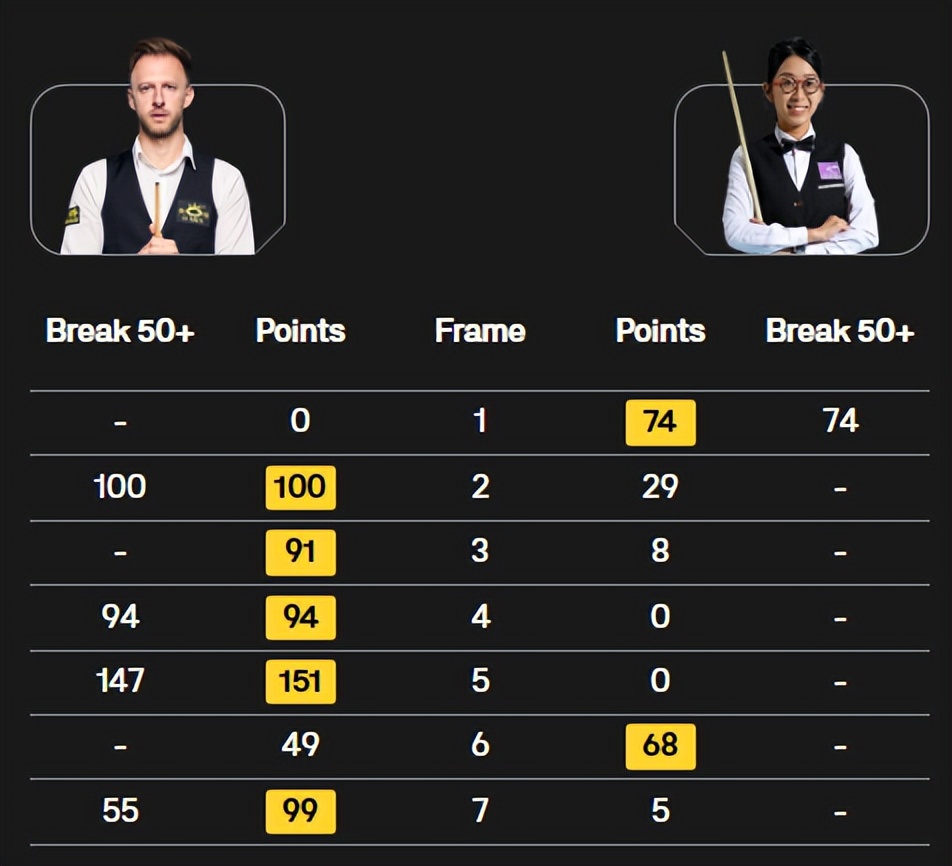 在10月7日白天场次进行的延期资格赛中,新科世锦赛冠军赵心童,5-2战胜了持外卡参赛的中国斯诺克业余球手王信伯;世界第一特鲁姆普5-2战胜中国香港女球员吴安仪,其中第5局更是轰出了满分147,这是特鲁姆普个人职业生涯第9杆满分147!