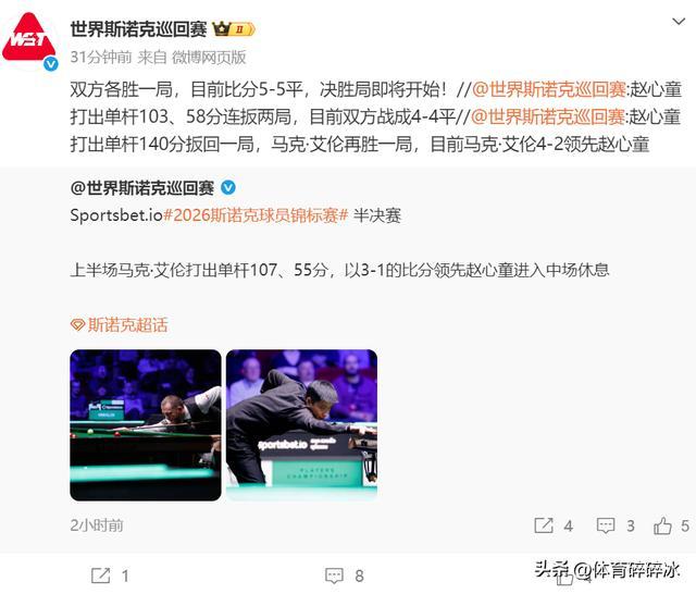 回来之后,赵心童就开启的反击模式。第五局,他单杆140分拿下,第六局,艾伦打出来了单杆65分,两次上手赢下比赛。随后,赵心童单杆107分赢下了第七局,又单杆58分赢下了第八局,这样比分一下就来到了4-4平。