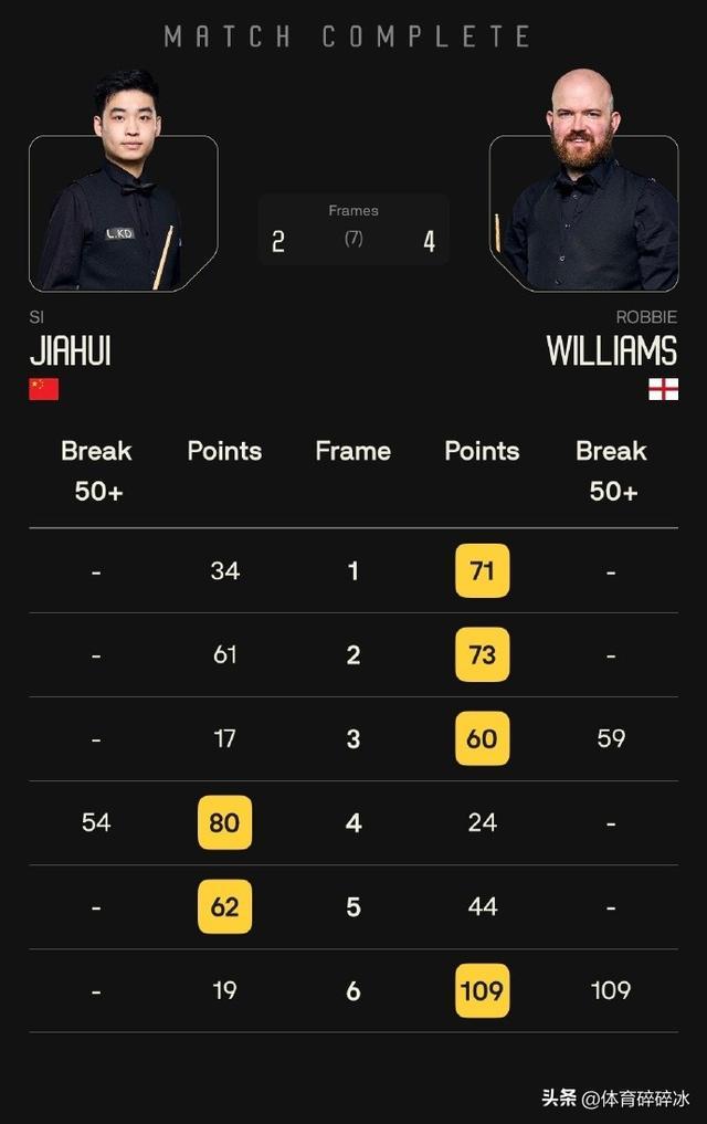 斯佳辉对阵的是排在56位的罗比威廉姆斯,这场比赛,斯佳辉每局都有机会,不过单杆得分十分一般,只在第第四局打出来了一个单杆54分。罗比则是一杆破百,一杆50+,以4-2的比分晋级成功。斯佳辉爆冷后,成为了本次威尔士首位出局的前16选手。