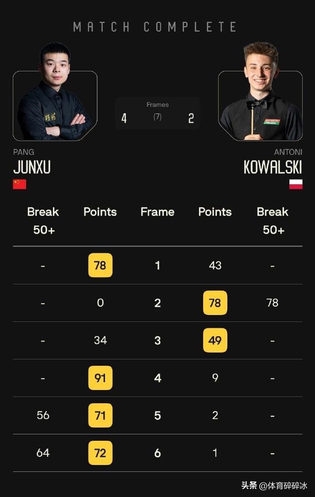 庞俊旭本次对阵的是排在72位的科瓦尔斯基。这场比赛,两个人打的也一般,庞俊旭有两杆50+,科瓦尔斯基只有一杆50+。最终,庞俊旭在1-2落后的情况下,打出来了3连鞭,以4-2的比分晋级成功。