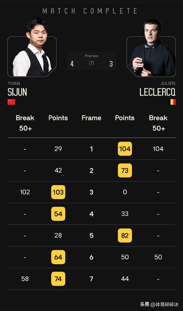 袁思俊对阵的是排在76位的勒克莱。这场比赛,两个人各有一杆破百一杆50+,发挥的差不多。最终,他们也进入到了决胜局的争夺。第七局,袁思俊靠着一个单杆58分锁定胜局,以74-44的比分获胜,4-3晋级成功。