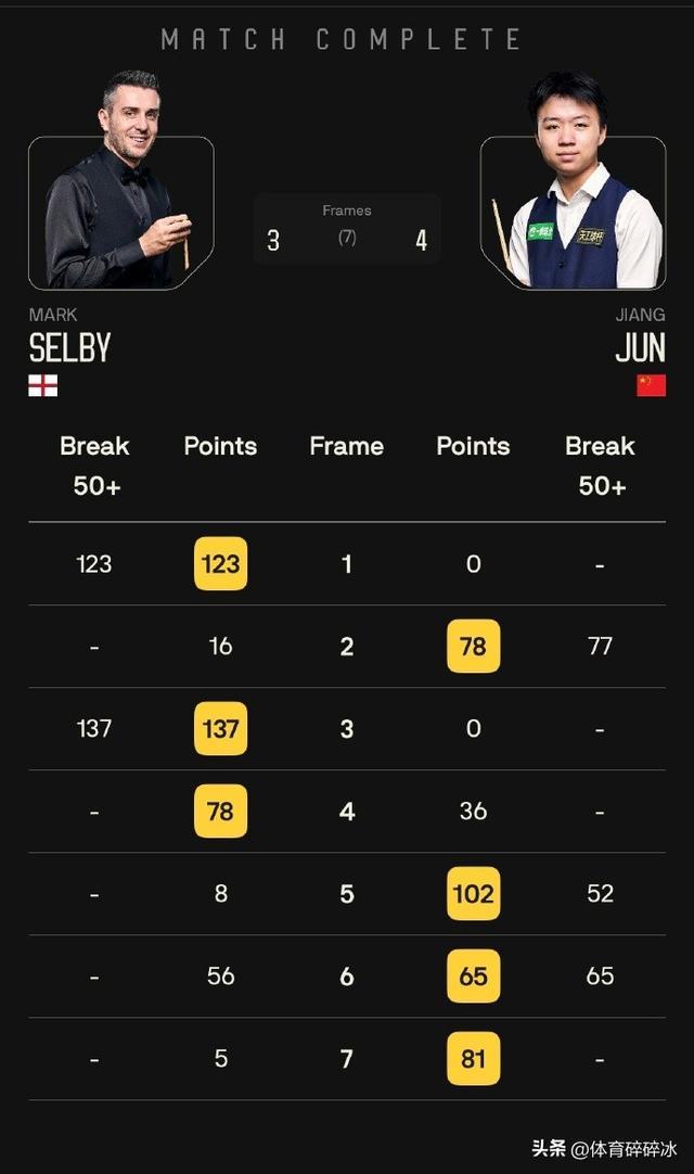 在塞尔比的强压下,江俊单杆77分赢下了第2局。即使这样,四局比赛结束之后,江俊也被打成了1-3。随后的第5局和第六局,江俊打出来了两杆50+,3-3追平比分。第四局,经过缠斗,江俊81-5赢下比赛,以4-3的比分反杀塞大师晋级成功。
