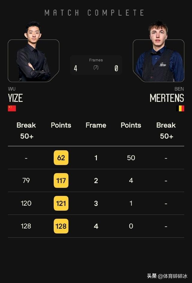吴宜泽本次对阵的是排在67位的默滕斯。第一局,双方各有得分,几次上手之后,吴宜泽62-50分赢下了比赛。随后,他打出来了单杆79分、120分以及128分,轻松晋级成功。