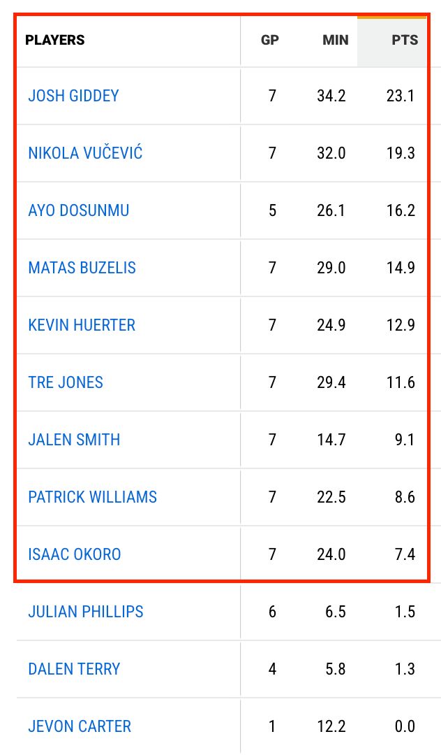 赛季至今,公牛6人场均得分上双。帕特里克-威廉姆斯、奥科洛、杰伦-史密斯的输出也在场均7+。