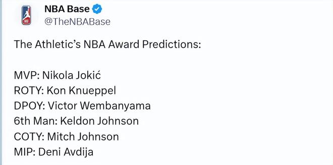 北京时间2月27日,知名美媒TheAthletic(TA)对2025-26赛季的常规赛六大奖项进行预测,他们看好约基奇成为MVP,克努佩尔当选最佳新秀,马刺三人获奖成为最大赢家。具体预测和解析如下——