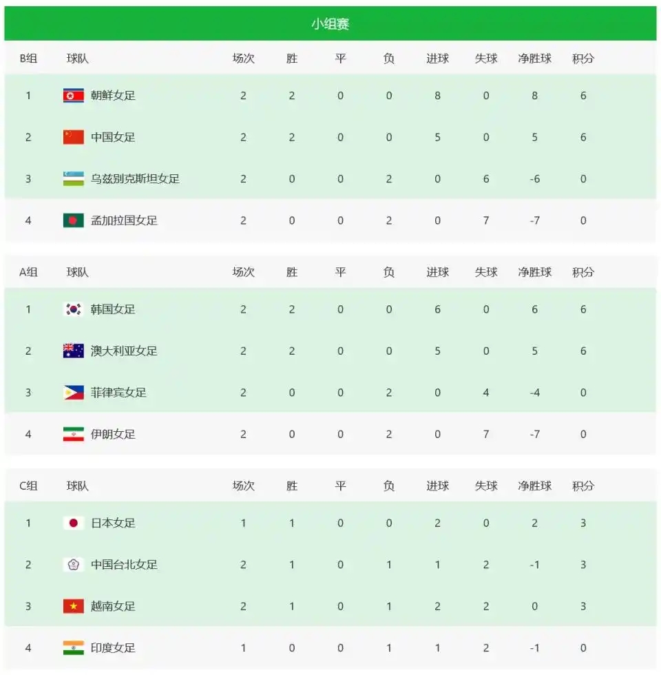 目前朝鲜女足目前凭借净胜球优势暂居小组第一(进8球失0球),中国女足紧随其后(进5球失0球)。