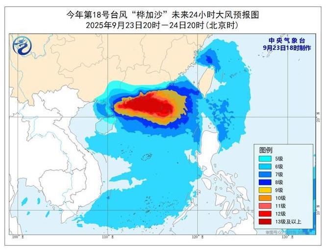 大风预报:23日20时至24日20时,巴士海峡、南海大部、西沙群岛、中沙群岛、南沙群岛、东沙群岛及黄岩岛附近海域、台湾海峡、台湾以东洋面、东海南部、北部湾、琼州海峡、福建南部沿海、广东南部地区及沿海、珠江口区、海南岛沿海、广西沿海、台湾岛沿海将有6-9级大风、阵风10-11级,其中,广东沿海和南海北部的部分海域风力有10-13级、阵风14-15级,台风中心经过的附近海域或地区风力可达14-16级、阵风17级以上。