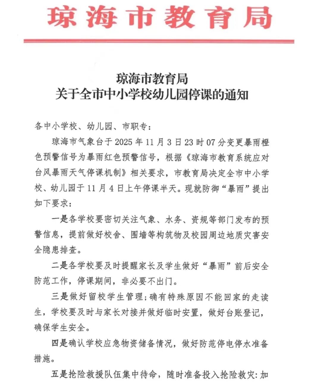 据直播海南,11月4日上午琼海全市降雨量持续较大,经研究决定,琼海各中小学、幼儿园上午停课半天,提醒学生家长请履行好监管责任,避免学生外出活动,防范溺水、坠物等安全风险,返校时间待通知。