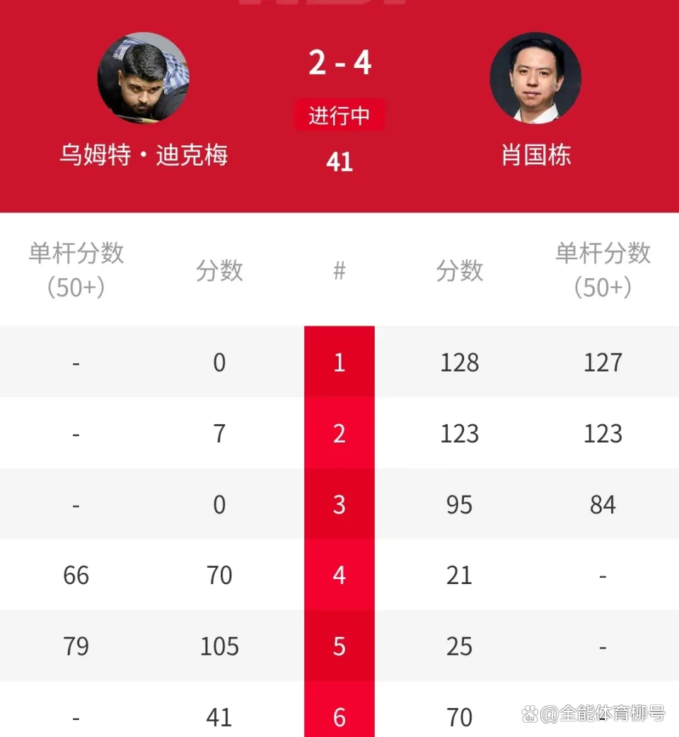 北京时间9月24日凌晨,2025年斯诺克英国公开赛继续进行。刚刚结束的正赛第一轮的一场焦点比赛中,武汉公开赛双冠王肖国栋状态出色,他轰出两杆破百(127分、123分)和一杆50+(84分),总比分4-2完胜乌姆特-迪克梅,夺得2连胜。