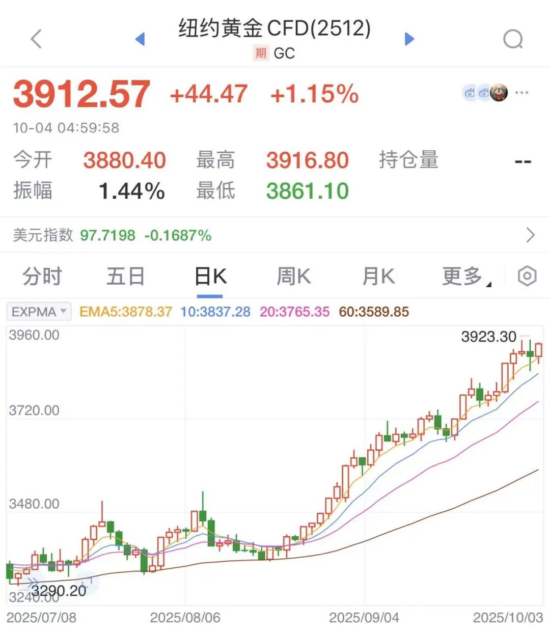 国际金价银价大涨,COMEX黄金期货涨1.14%,报3912.10美元/盎司,本周累计上涨2.71%,现货黄金价格直冲3900美元,现报3886.47美元/盎司。COMEX白银期货涨3.45%,报47.97美元/盎司,本周累计上涨2.82%。