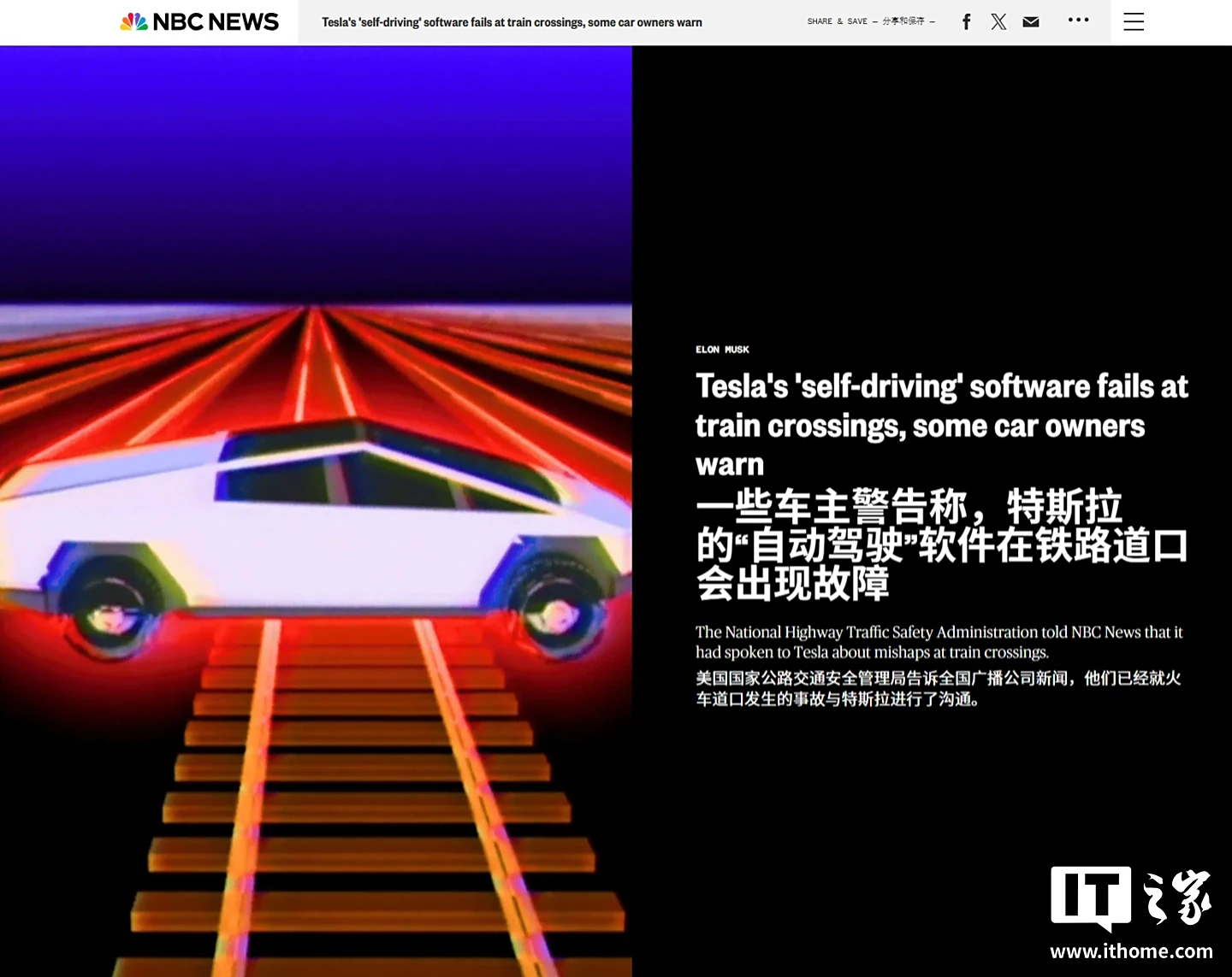 IT之家 9 月 17 日消息,据 NBC News 报道,6 月的一个傍晚,伊塔洛・弗里戈利(Italo Frigoli)正试用其特斯拉汽车的 FSD 辅助驾驶系统,途中遇到一处铁路道口。当时道口栏杆正在降下,警示灯闪烁,一列火车正疾驰向交叉口。