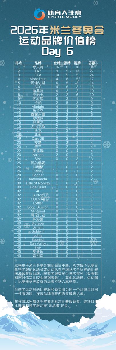 北京时间2月13日清晨,2026年米兰-科尔蒂纳冬奥会结束第六个比赛日的争夺。当天,共有九个项目进入金牌争夺战。瑞典品牌夸夫特虽然只收获了1金1银1铜,但依旧守住了“2026年米兰冬奥会运动品牌价值榜”的榜首位置。而排名第二的意大利品牌EA7,则凭借3金1银2铜的成绩,将与榜首的奖牌总数差距缩小至7枚。