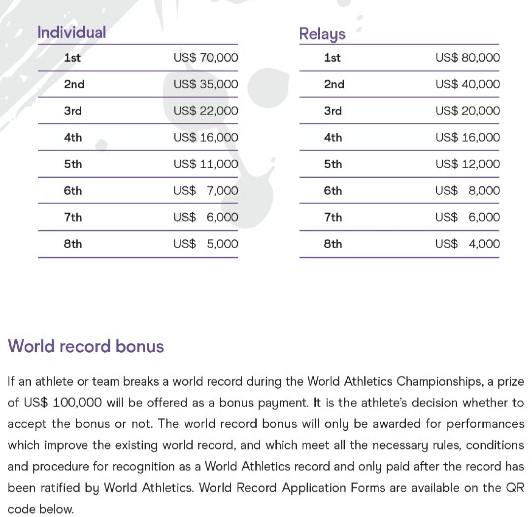 肯尼亚7金2银2铜第二,奖金60.4万美金。中国在女子链球(赵杰和张家乐)斩获1银1铜、在男子跳远(石雨豪)斩获铜牌、在男子20公里竞走(王朝朝)斩获银牌,2银2铜4块奖牌并列第22,奖金11.4万美金。亚洲国家中,巴林1银1铜、韩国1银、东道主日本2铜排名第40,奖金4.4万美金、卡塔尔1铜上榜。亚洲第一显然不是中国田径队的目标,考虑到人种差异,评判中国田径单项是否成功的标准不是争金夺银摘铜,而是能否出现在决赛舞台,根据赛制决赛前八都能获得奖金!金钱量化,这应该是大众最能接受的标准,毕竟中国田径已经发展那么多年了,哪些项目应该达到预期却没有?哪些超出预期?像径赛,出了刘翔,苏炳添那种划时代的人物,竟然没有1个人晋级决赛,无论是个人单项还是接力!像男子100米栏,三人都止步半决赛,你能说这个阶段是成功的吗?而且和日本比,中国径赛也落后了!