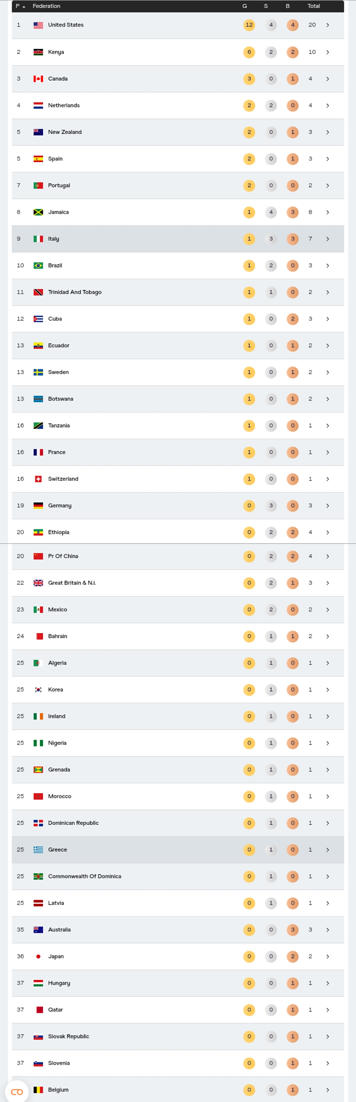 至此中国田径队以2银2铜排名第20,依旧是亚洲第一。巴林1银1铜、韩国1银、东道主日本2铜较之前一个比赛日下降了4位来到第36、卡塔尔1铜则下降5位来到第37。整个亚洲很可能以0金收官,毕竟几项夺金点都因为伤病或者竞技状态而无缘领奖台甚至决赛,或者直接退赛了!比如世锦赛三冠得主巴尔希姆赛前退赛,女子标枪巴黎奥运冠军北口榛花带伤作战……真正具备夺金实力且有百分百身体状态的只有日本选手山西利和,他是目前世界纪录保持者,两届世锦赛冠军,但因为被红卡3张罚时2分钟而退出男子竞走20公里冠军竞争!