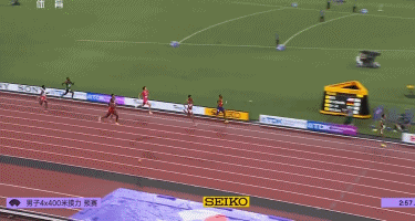 男子4x400米接力预赛,由梁宝棠 、张起宁、刘凯和郭龙宇组成的中国队跑出了3分00秒77的国家纪录!最后一棒中国队一度升到第三,但在最后的直道时被卡塔尔队反超,美国队四棒也在玩命追赶,但被郭龙宇完全压制!最后冲线前,肯尼亚队稍微领先一点过线(下图)。最终中国队排名小组第五,把在广州接力大赛上创造的3分01秒87的全国纪录,拔高了1秒10,而且这是本次世锦赛创造的第一项中国全国新纪录。同组三届卫冕冠军,世锦赛该项目十二冠美国队在第三棒出现交棒失误排名第六,已经确定无缘晋级决赛! 在第二组的比赛结束后,中国队最终排名第11位无缘决赛,但小伙子们在该项目的世锦赛首秀已经创造了历史!