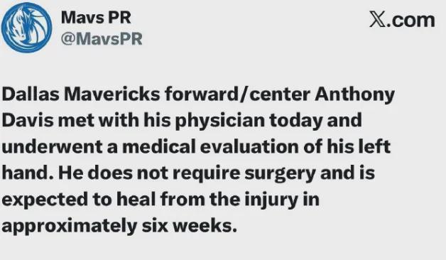 还是据Shams报道,浓眉今天前往洛杉矶,跟手部专科医生进行会面,重新确定了治疗方案,不做手术了。